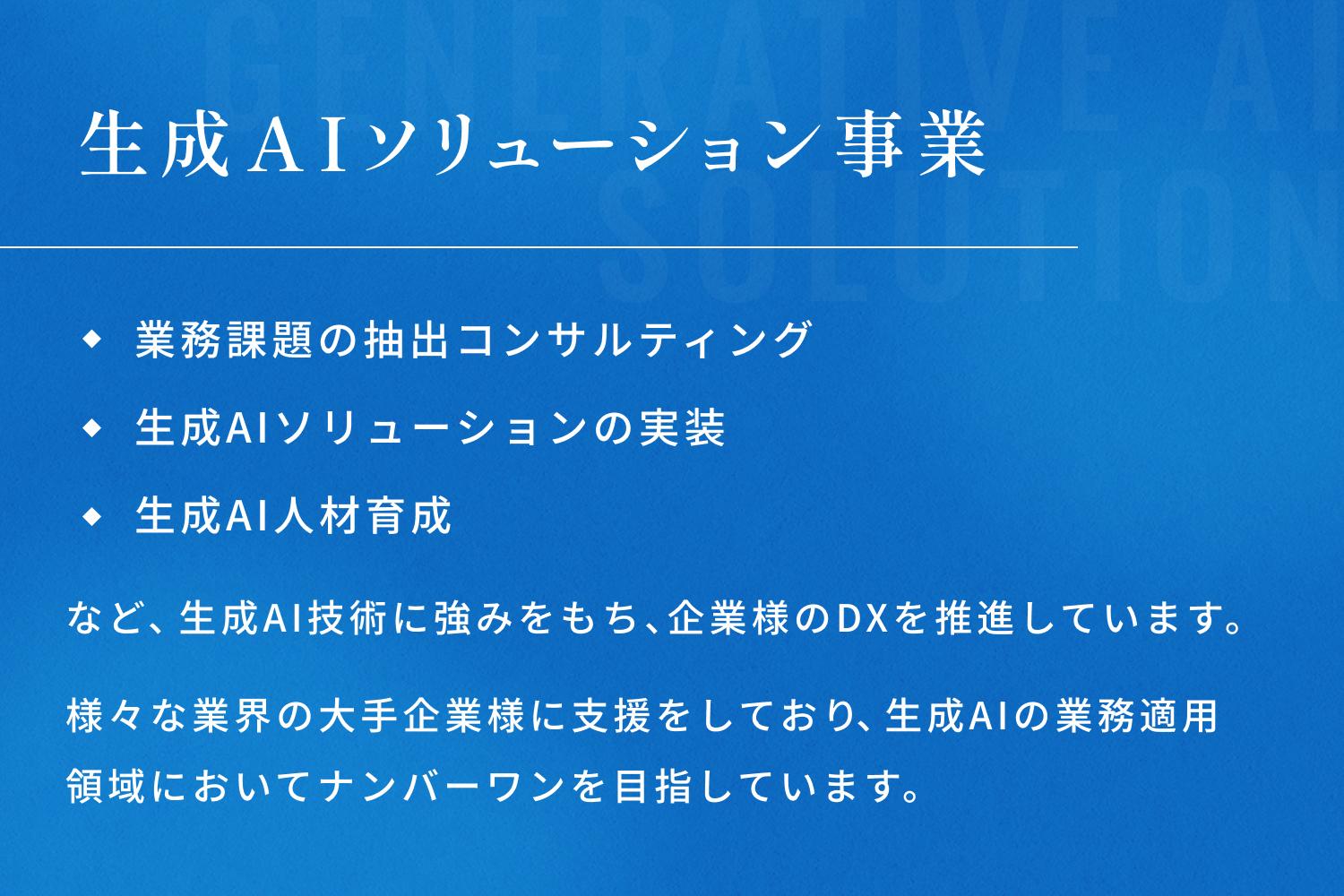 "AIネイティブ"な視点での戦略から実装まで一気通貫で支援を行い、単なるAIツール導入ではなく、AIを前提とした業務プロセスそのものの再設計を行うコンサルティング・SI事業を展開しています。