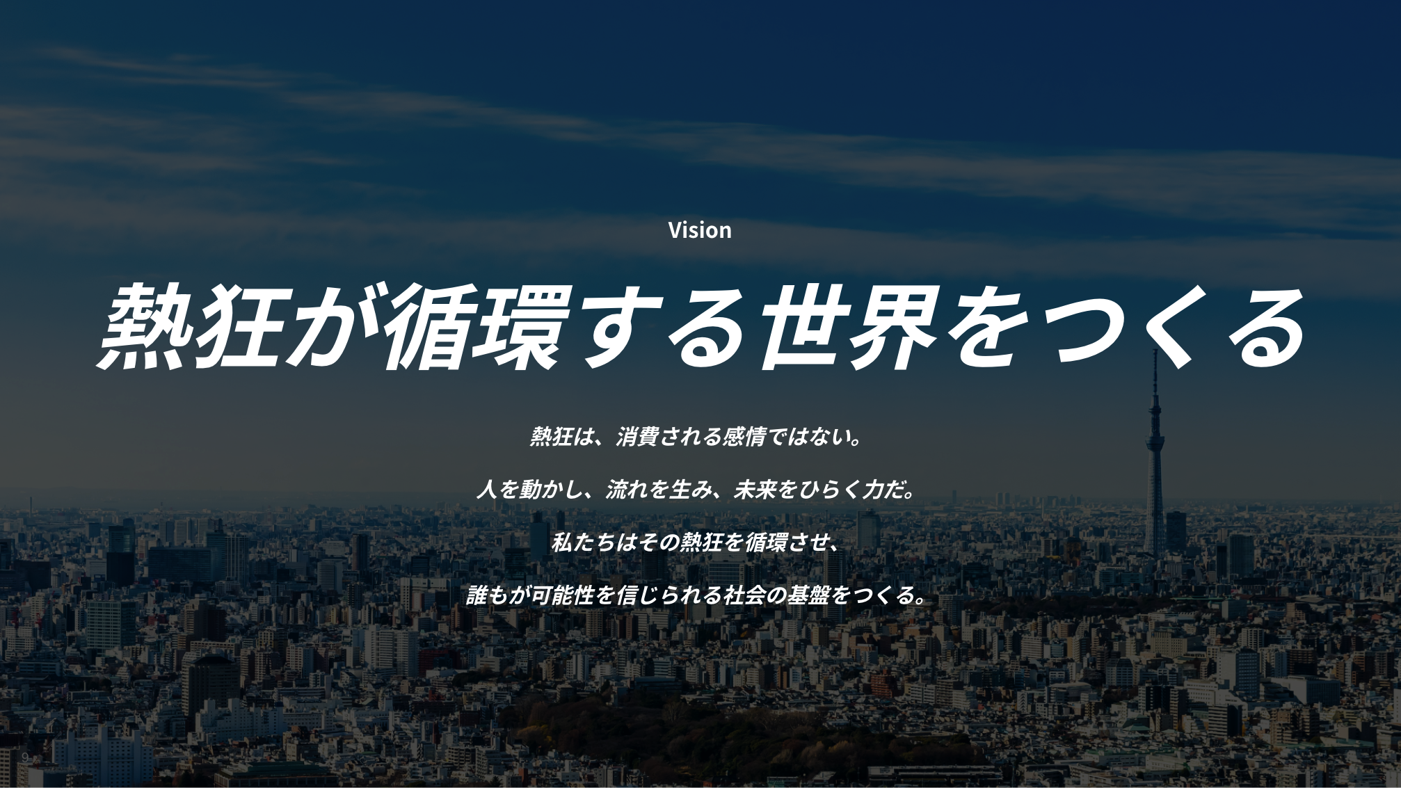 パーパスに「産業革命の中心を、ここに。」を掲げ、個人の「好き」や「熱狂」といった感情を起点に、新しい経済価値と機会を生み出しています。