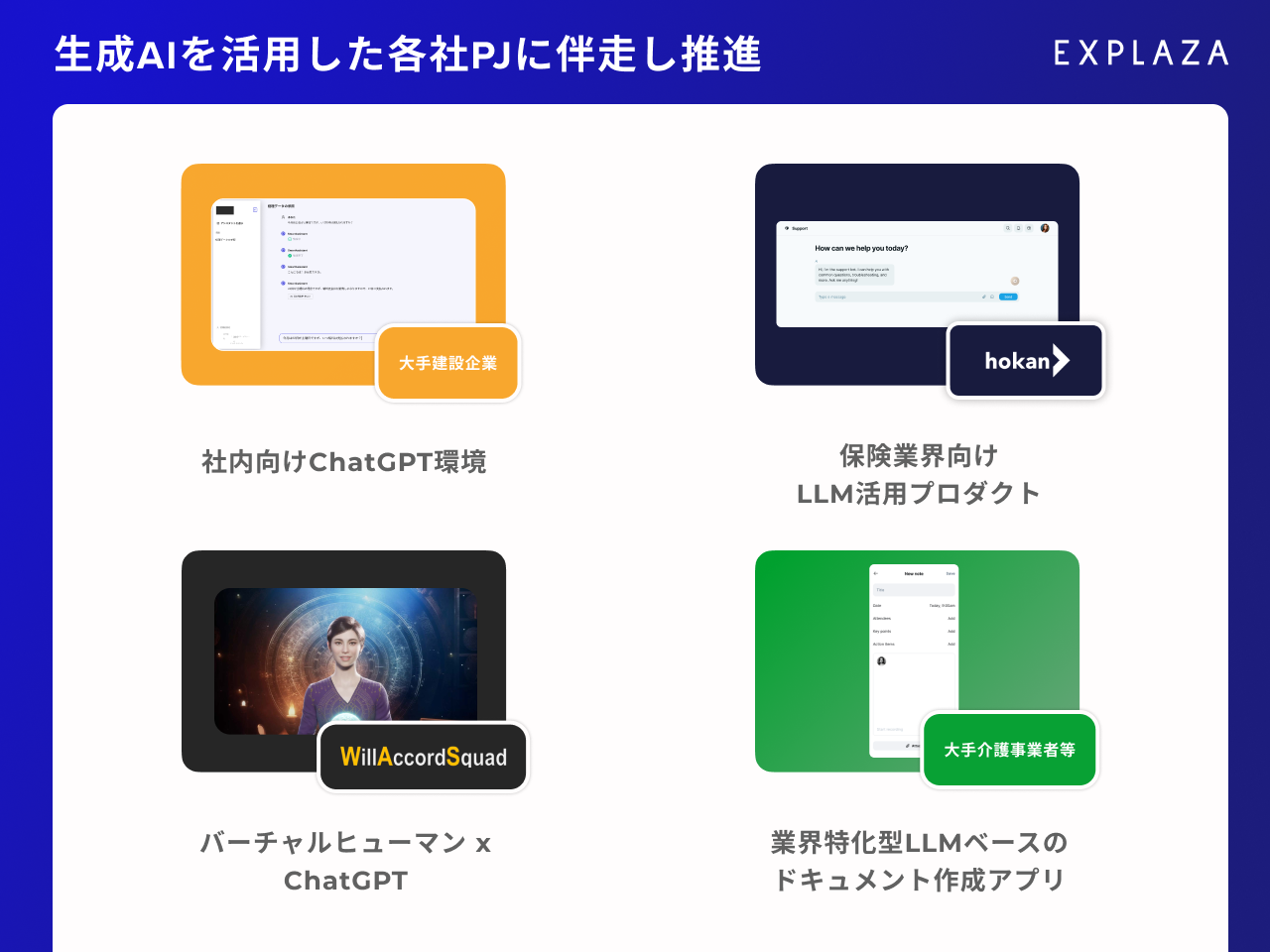 エクスプラザは、「一人ひとりの可能性を拡げる、想像を超える未来を実装する。」をミッションに掲げ、生成AIの社会実装に取り組む企業である。生成AIを活用したプロダクトの自社開発や、他社との協業によるプロダクト・事業開発を通じて、新たな価値創出を推進している。その根底には、情報、所得、地域間をはじめとする格差を解消し、人々がより豊かに暮らせる社会を実現したいという強い想いがある。