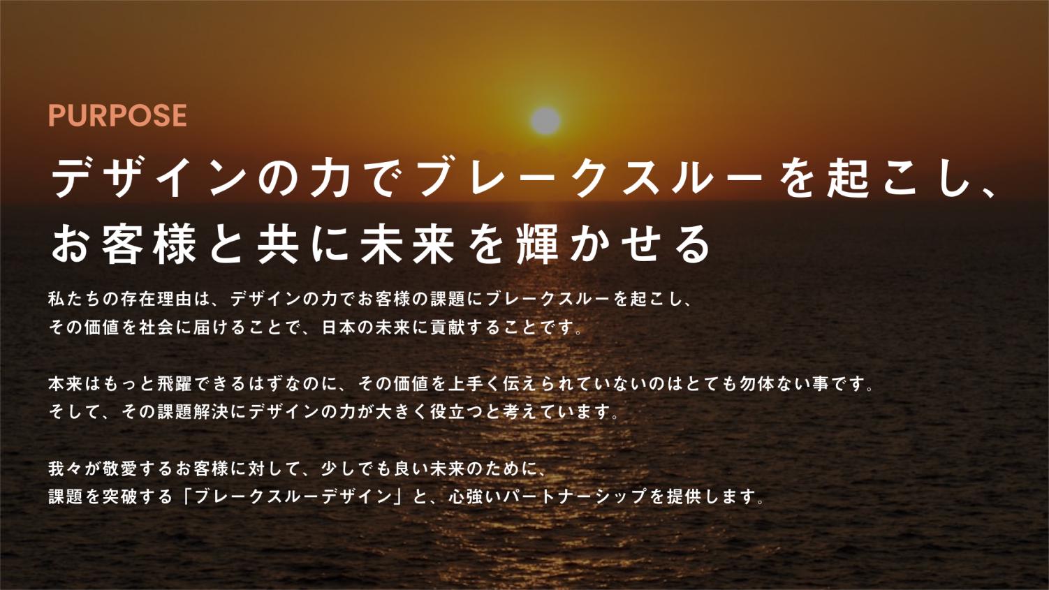 「デザインの力でブレークスルーを起こし、お客様と共に未来を輝かせる」をパーパスとして掲げ、マーケティング・デザイン支援を行っています。