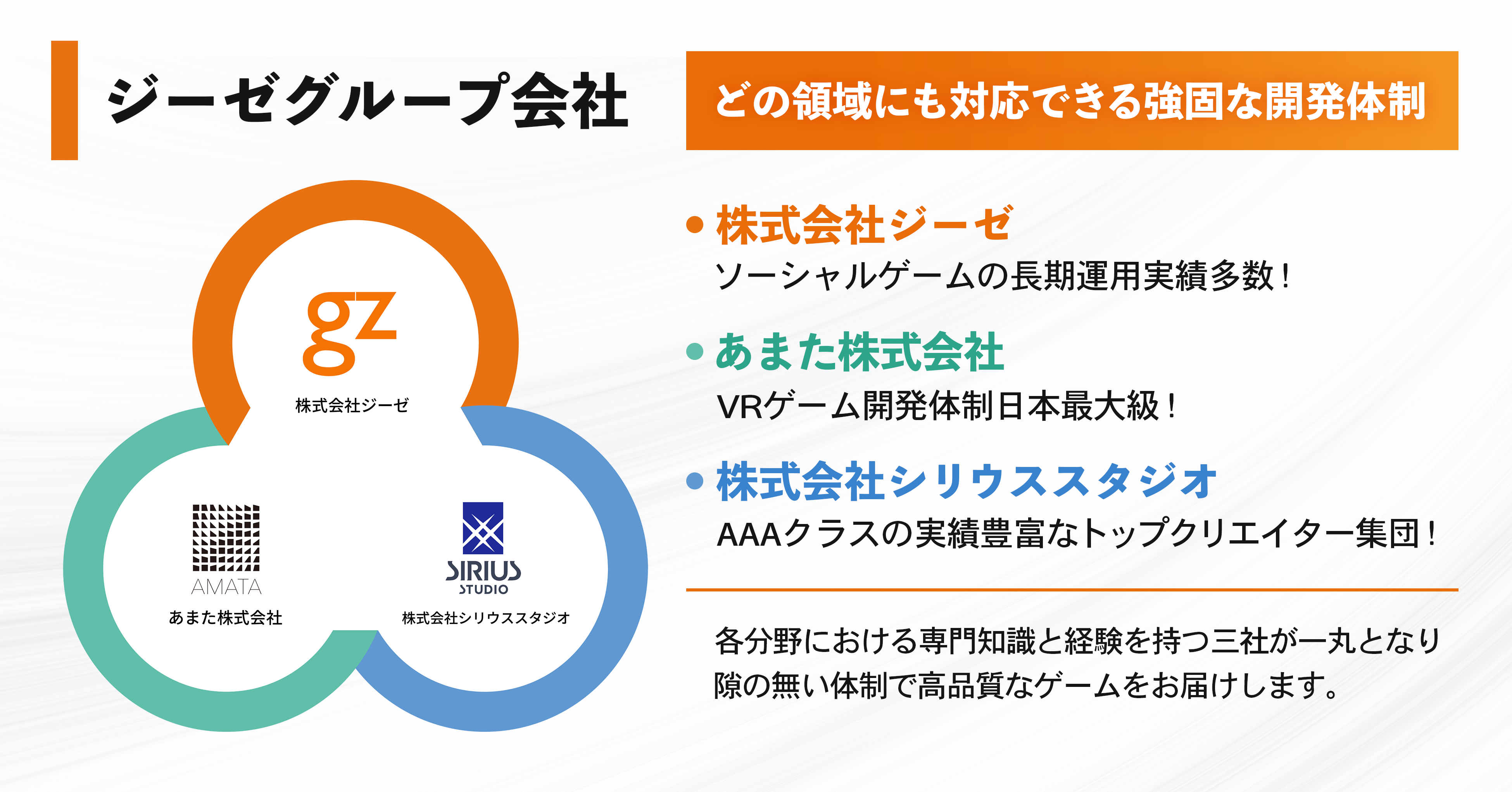 私たちはこれまでのソーシャルゲーム開発に加え、今後はVRやコンシューマタイトルなど、より多様で先進的なゲーム開発にもグループ一丸となって取り組んでいきます。「あまた社」が持つマルチプラットフォームに対応できる総合的な開発力、「シリウススタジオ社」が誇るグローバルで戦えるハイクオリティな開発力を融合し、新たな挑戦を形にしていきます。