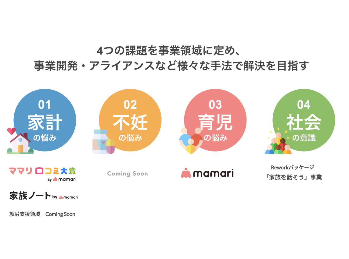 ママ向けQ&Aアプリ/情報サイト「ママリ」の開発および運営、自治体および企業向け産休・育休の取得支援、子育て包括支援事業(DX、EBPM等)