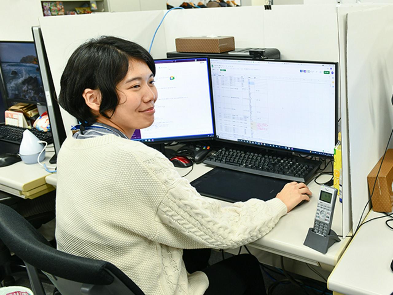 配属先の「ゲーム事業部 デザイン一課」は現在28名体制です。 プロジェクト朝礼・夕礼、定例会議、班活動などで 職種を問わずつねに話し合いながら開発を進めていく環境があり、 休憩時間にはみんな集まって、新作ゲームで遊んだりすることも。 自分の意見・アイデアも言いやすく、いつもにぎやかで活気があります︕