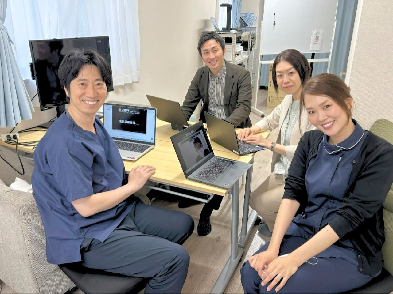 単独で医院に訪問しますが、月に2度はオフィスで集合して、情報交換やミーティング、勉強会を実施しています。また各自が単独で仕事を進めるだけでなく、アシスタントが業務サポートを行なったり、各事務長のノウハウを集約してシナジーが生まれるように仕事をオペレーションしています。
