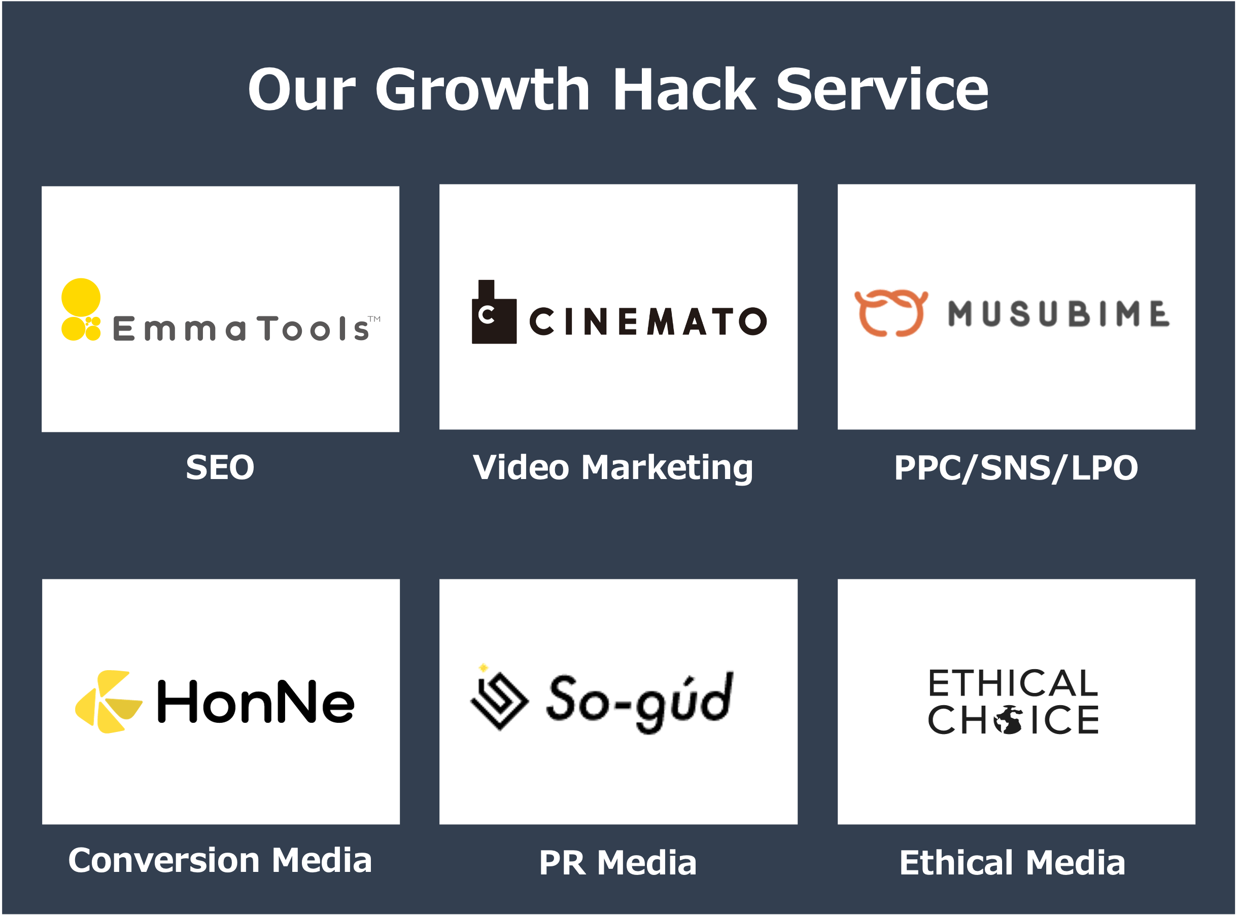 アメリカ発祥の「グロースハック」や「カテゴリーデザイン」にいち早く取り組み、自社でカテゴリーを生み出すカテゴリーグロース事業と、クライアントのカテゴリーを生み出すカテゴリーブランディング事業の2事業を展開しています。