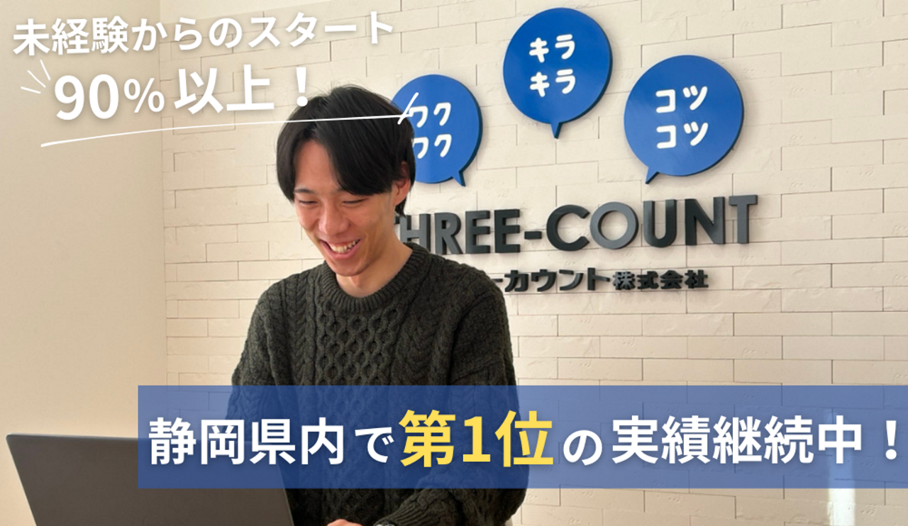 スリーカウント株式会社は「WEBマーケティングに特化した企業が静岡県にもある」をセルフイメージに、本社オフィスを静岡県浜松市、静岡支店を静岡県静岡市に置く、創業17年目の企業です。 設立は2007年6月、「ホームページ企画・制作」や「リスティング広告運用代行」「Indeedの運用代行」に取り組んできました。 地元・静岡県内の一部上場会社(複数社)をはじめ、県内外600社以上の企業様にWEBサイトを中心としたサービスを提供しています。 売上高は設立から16年間連続で順調に増加を継続。表に出る事はなくとも、文字通り“黒子”として地元企業のWeb戦略を支えています。顧客の問題解決がゴールの為、プッシュ型営業などは行いません。顧客の為にならない事は、頼まれても引き受けない事も特徴です。 私たちを通じてお客様がワクワクするような新しい楽しい取り組みや事業展開への発展。キラキラするような夢やアイデア、冒険。それらをそれらをコツコツ1つひとつ確実に前に進めていく。 これらをお客様と一緒に叶えていける企業を目指します。 # 経営理念:ワクワク・キラキラ・コツコツ 「ワクワク」する情熱と希望を持ち、「キラキラ」した夢や想いを 「コツコツ」真面目に誠実に叶えていく、そんな会社を実現します。 # スリーカウントセルフイメージ WEBマーケティングに特化した企業が静岡県にもある # ミッション:スリーカウント存在する使命 WEBマーケティングのチカラを最大限活用し、企業の「集客」と「求人」という2つの問題を解決。黒子として支え発展させていく