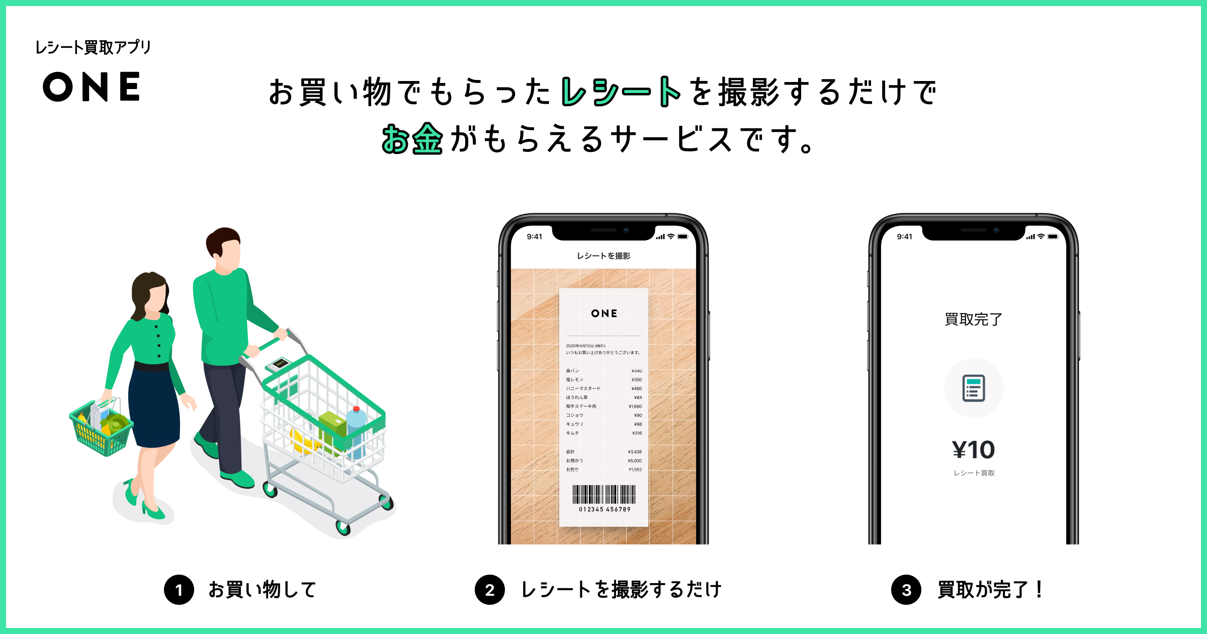 そんな私たちが生み出した「ONE」が実現するのは、レシート買取りの枠組みを超えた、もっとお得でワクワクするお買い物体験です。「ONE」は、日々のお買い物がお得になるだけではなく、ゲーム感覚で楽しくお買い物ができる、そんなプロダクトを目指しています。朝一息つくためのコーヒーが無料に。いつものランチが割引に。仕事終わりのご褒美ビールが半額に。