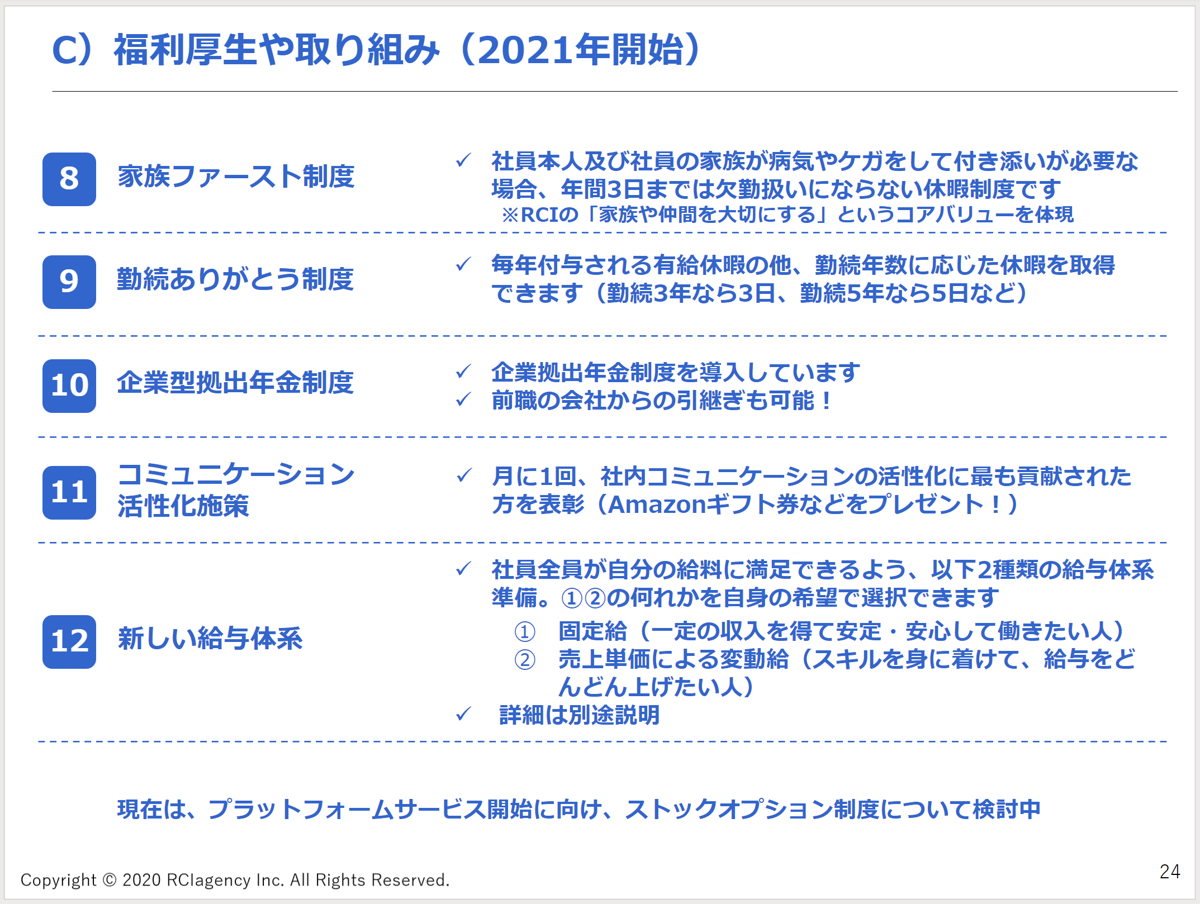 2021年も折り返しの段階ですが、既に5つの福利厚生や取り組みが開始されています。 社員の「こうなったらいいのに・・・」の声がしっかりとくみ取られる会社です。
