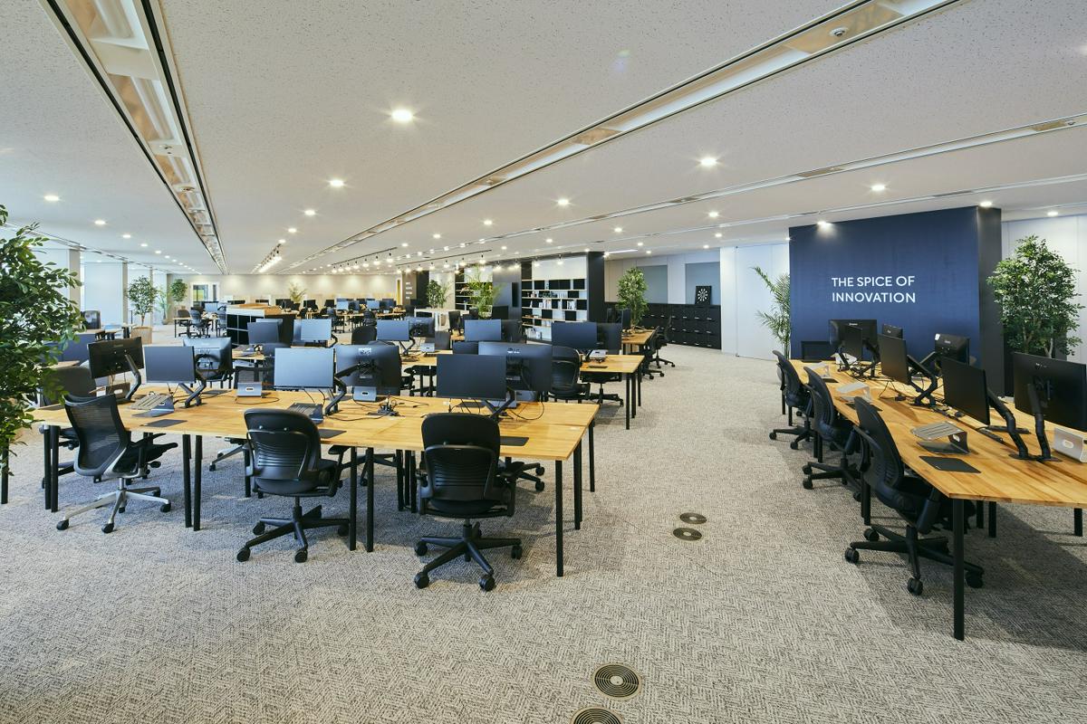 PR画像席間隔にゆとりがあり、交差するデスク配置の設計がコミュニケーションを触発します。