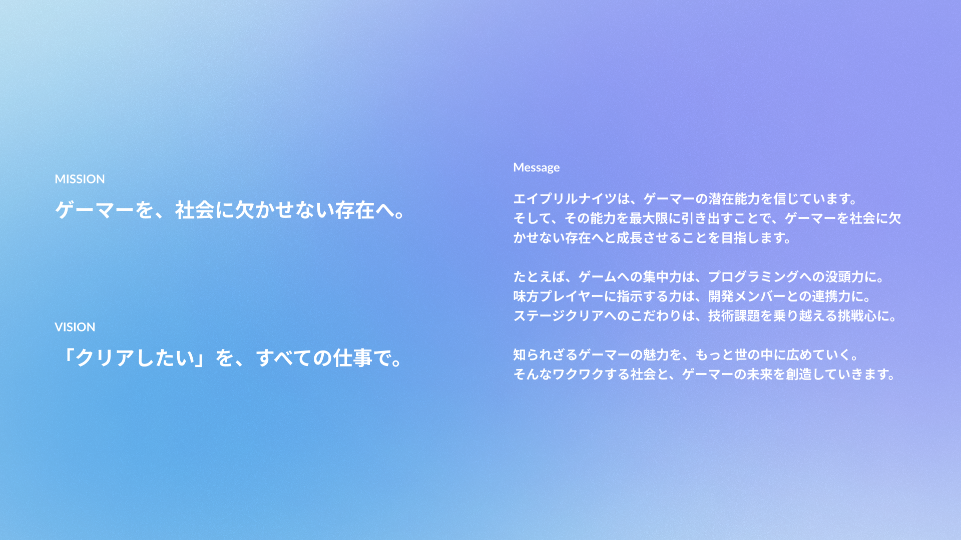 ゲーマーならではの視点と情熱で、顧客ビジネスの成功に貢献することがエイプリルナイツの使命です。