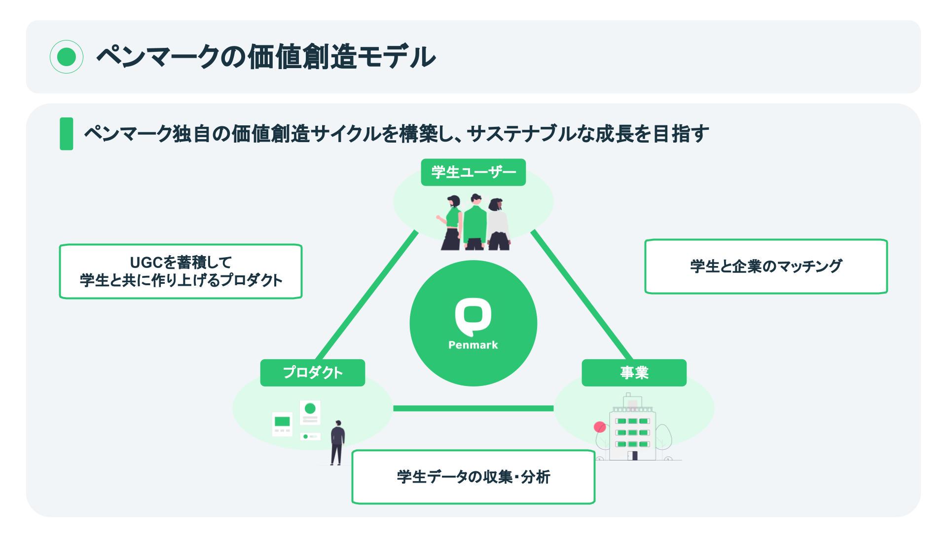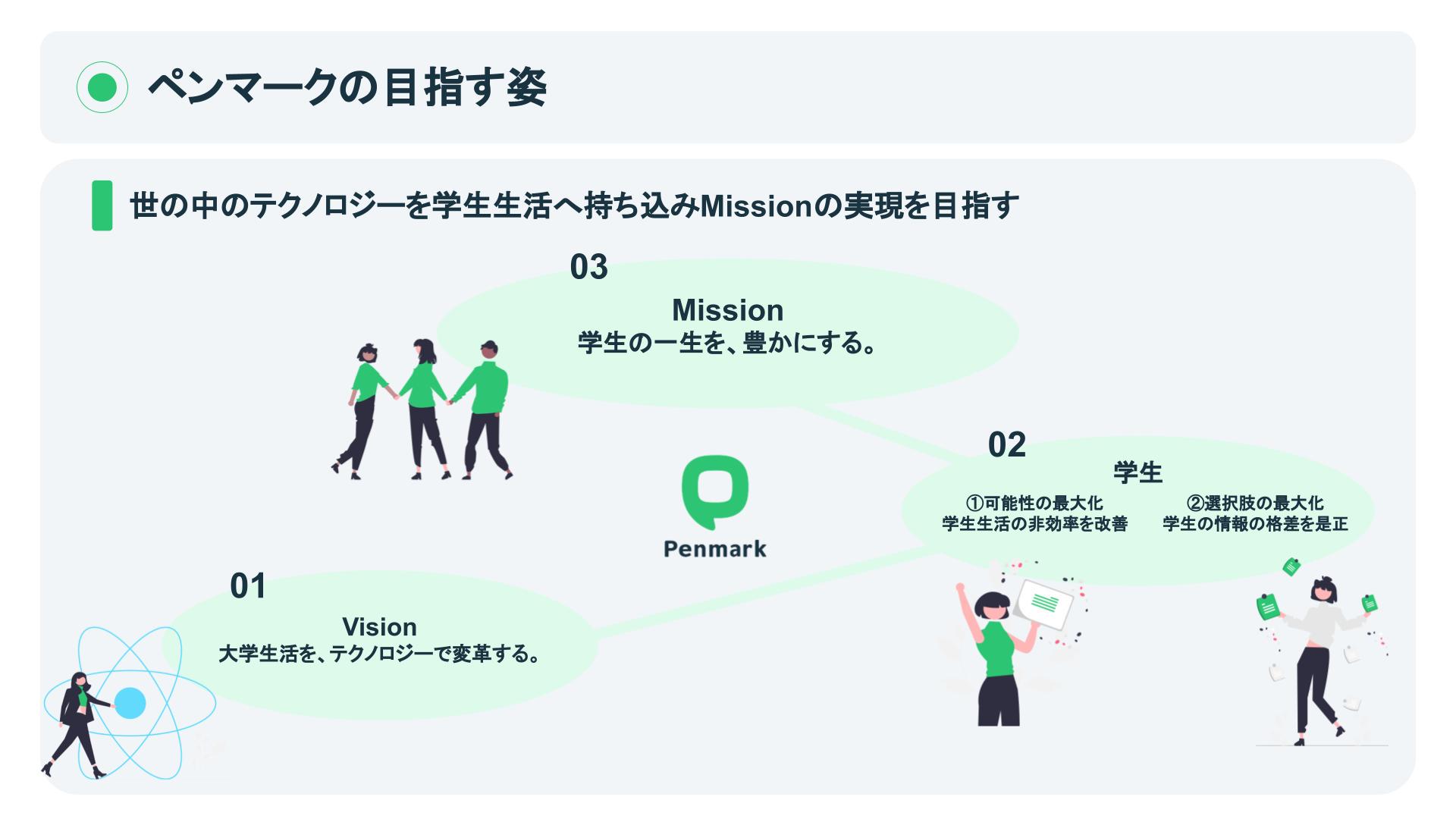 学習管理SNS『Penmark』の運営を主軸に、学生の一生を豊かにする様々な学生向けサービスを展開する。