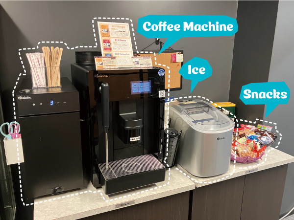 最高級コーヒーサーバー、各種コーヒー、ルイボスティー、スナックなどを無料で提供しています。