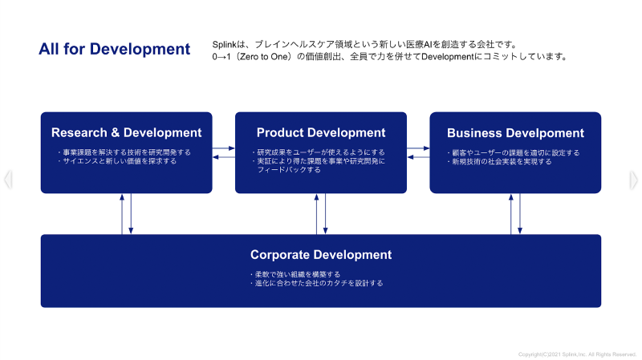 同社が大切にしていることは「サイエンスに裏打ちされたテクノロジーで人々に貢献する」ことである。そのため、同社は会社の成長フェーズに関わらず「0→1(Zero to One)の価値創出」を大事に考えている。開発体制も「Research & Development(R&D)」「Product Development(プロダクト開発)」「Business Development(事業開発)」の3つのチーム、それらを支える「Corporate Development(経営・組織開発)」に分けられている。それぞれのチームが連携することで、研究開発から社会実装までのプロセスを高速で回し、”非連続のイノベーション”を実現する開発パイプラインを整備している。