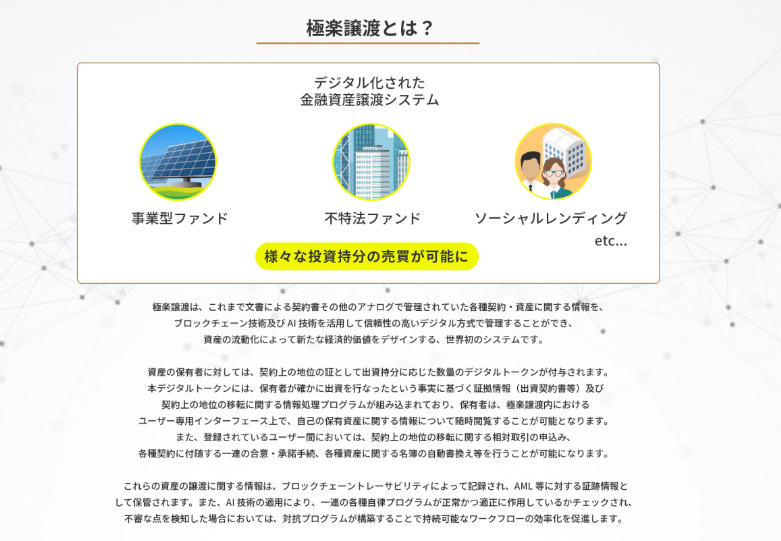 『極楽譲渡』は、ブロックチェーンを活用した最先端のテクノロジーにより金融商品の投資持ち分などを売買できる革新的な金融資産のデジタル譲渡システム。デジタル化された取引のルールに則り、デジタルトークンを使って売り手と買い手の当事者間で相対取引が行えます。このシステムにより、これまで煩雑な手続きや契約が必要だった取引を、誰でも簡単に、しかも非常にセキュアな環境で行えるようになりました。