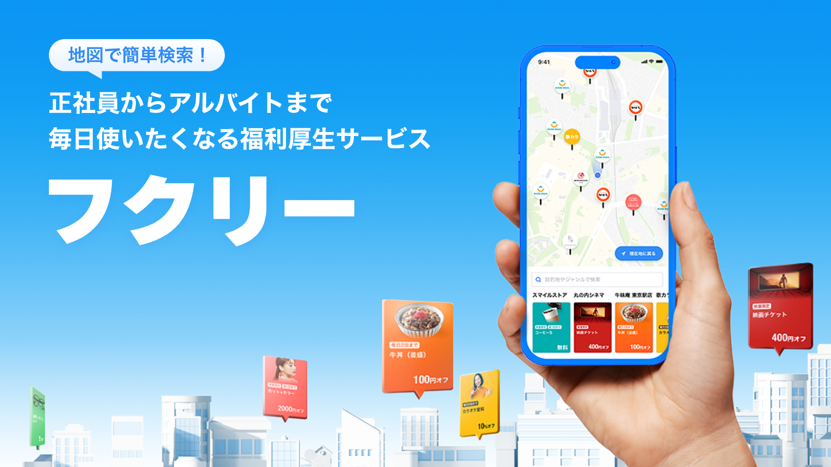 アルバイト・パート・派遣スタッフ等雇用形態や働く場所を選ばず使える福利厚生サービスです。カンリーが得意領域である地図情報を活かし、働く従業員の方向けサービスを開発しました