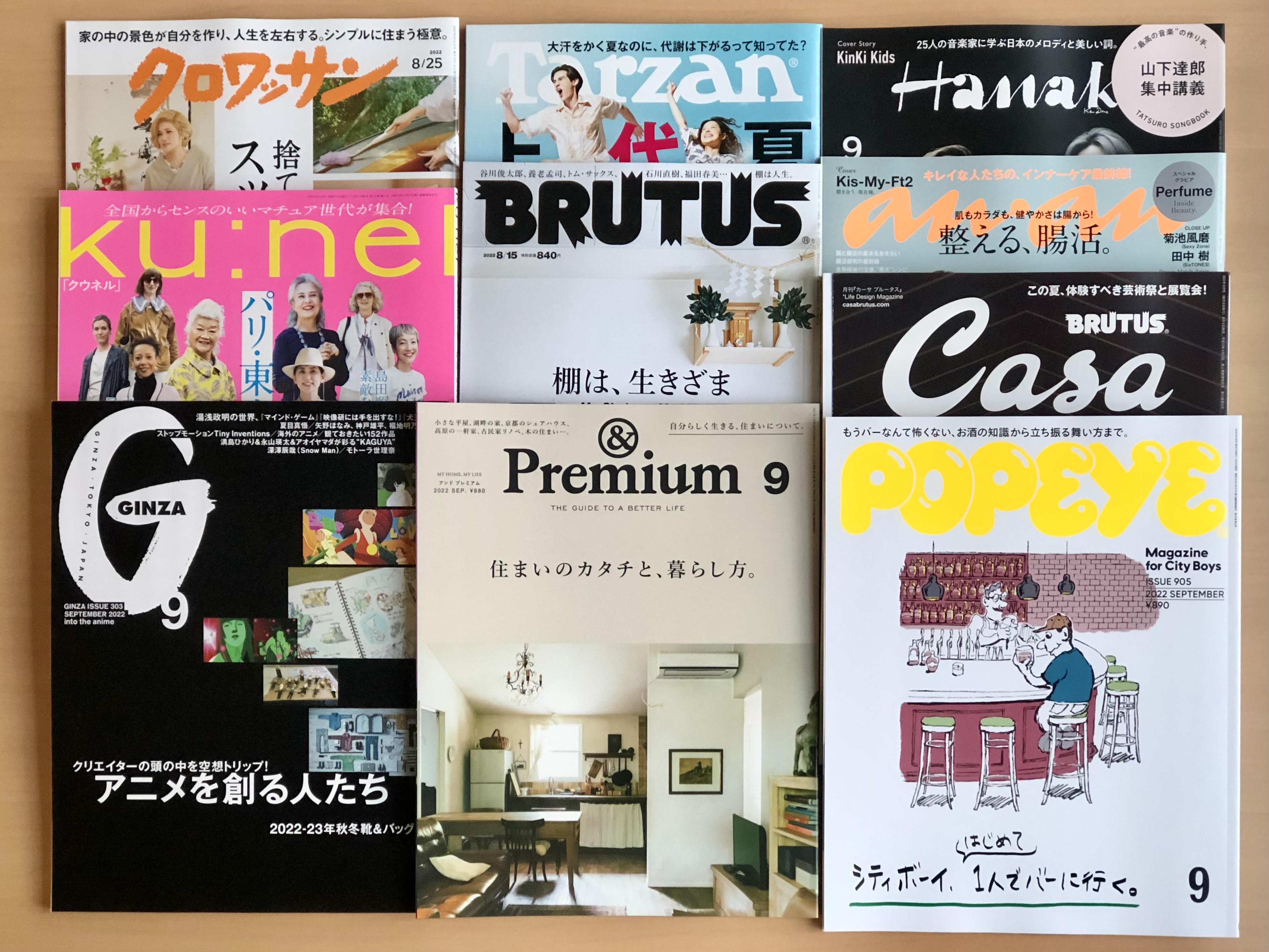 アンアン、ポパイ、クロワッサン、ブルータス、ターザン、ハナコ、ギンザ、カーサ ブルータス、クウネル、アンド プレミアム