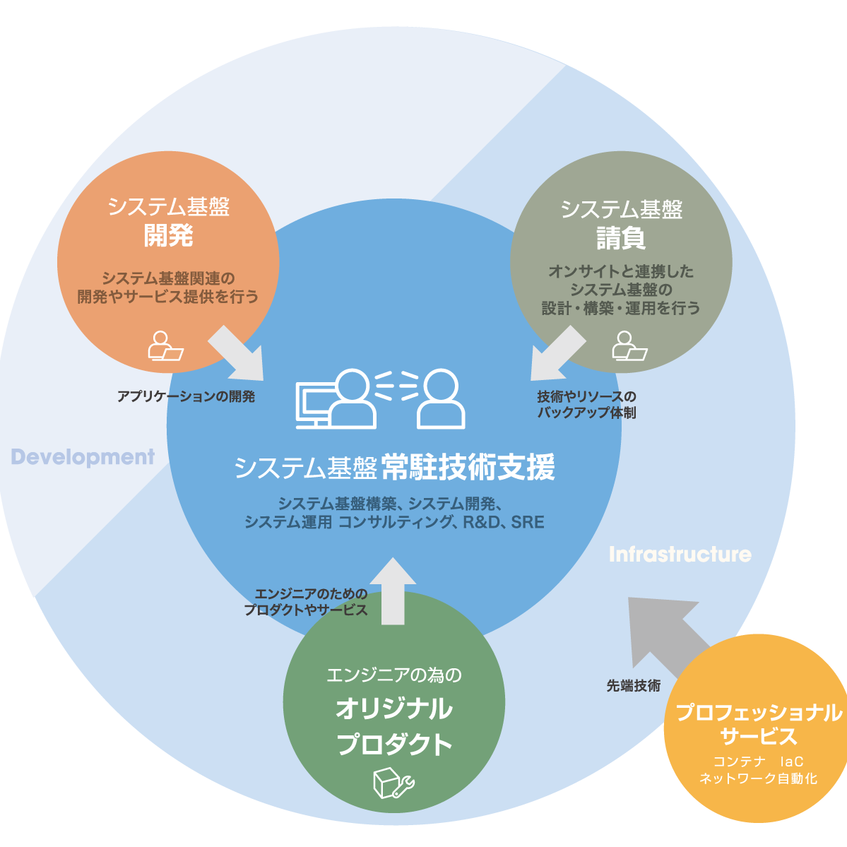 「エンジニアとお客様を笑顔にする」を企業理念とし、常駐技術支援から請負支援、自社オリジナルプロダクトの開発等様々なサービスを通してお客様に価値提供をしています。